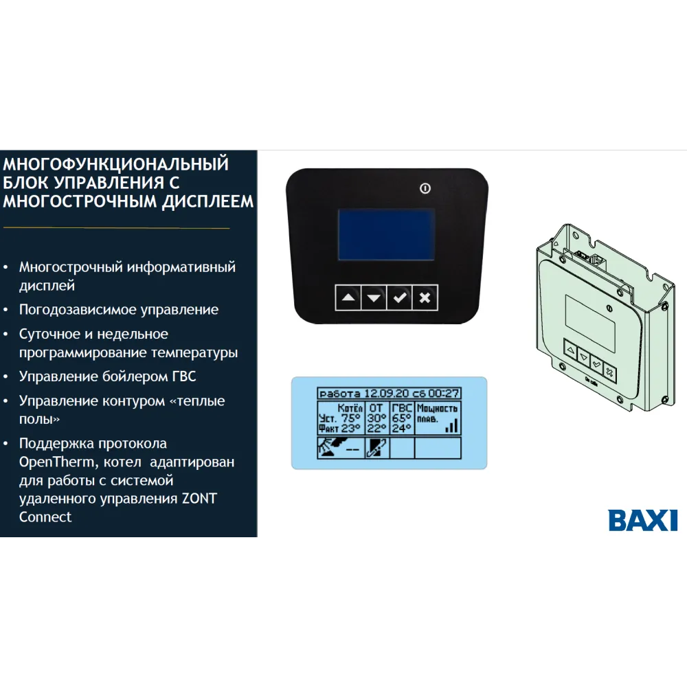 | Информация | Электрический котел BAXI AMPERA – это умная миникотельная, так как внутри установлен насос, расширительный бак и группа безопасности. Блок панели управления предусматривает работу с каскадом котлов, бойлером ГВС и несколькими контурами, в том числе с контуром «теплые полы» со смесительным трехходовым клапаном. В модели имеется погодозависимое управление. |
