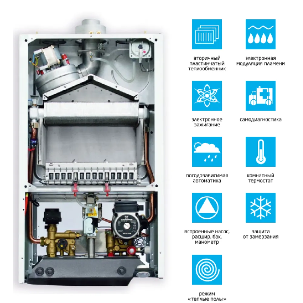 Вид: газовый , Вид топлива: природный газ, сжиженный газ , Мощность котла: 28 кВт, Тип: двухконтурный , Расположение: настенный , Камера сгорания: закрытая