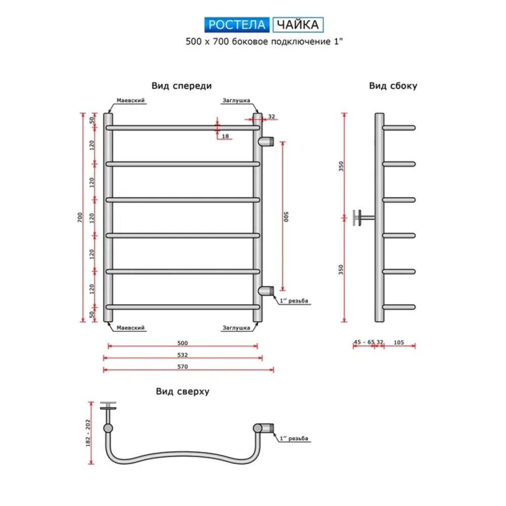 Полотенцесушитель водяной Ростела Чайка 500x700/6 1" боковое подключение