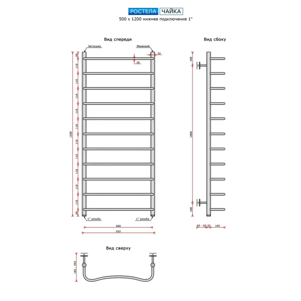 Полотенцесушитель водяной Ростела Чайка 500x1200/11 1" нижнее подключение