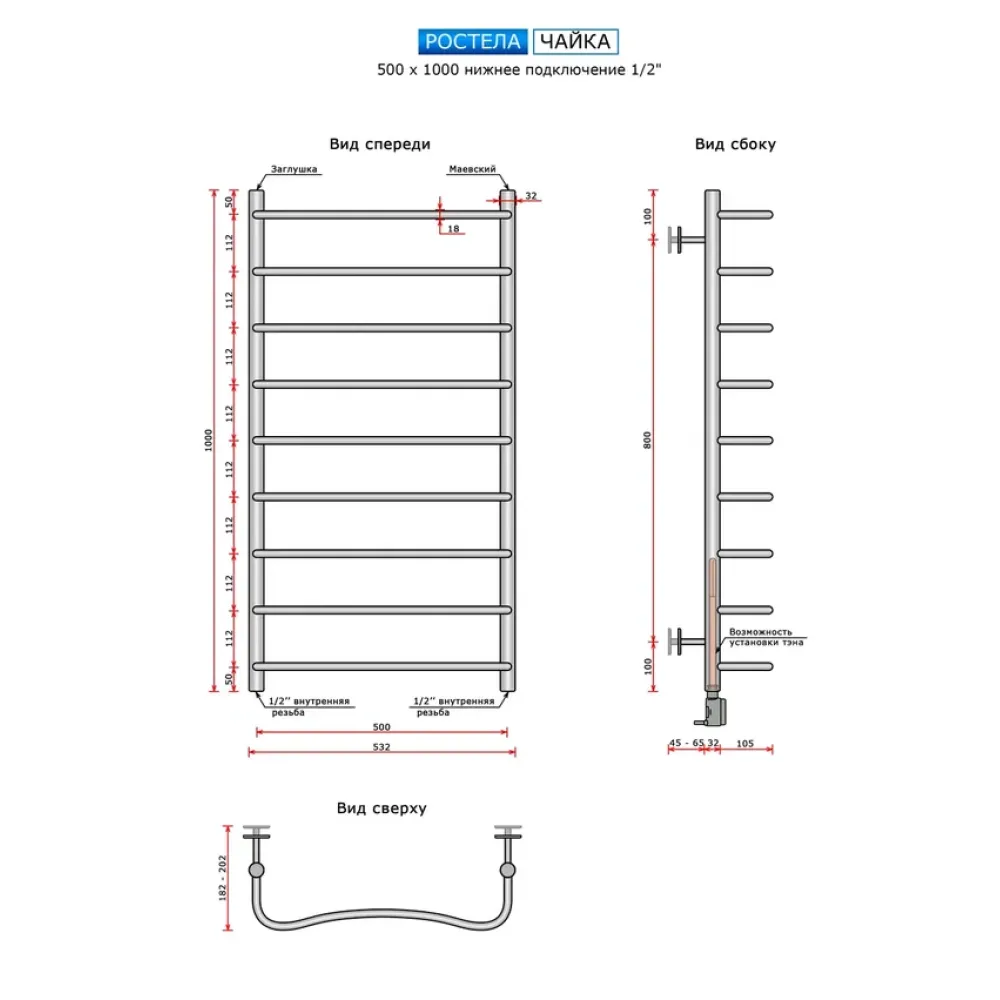 Полотенцесушитель водяной Ростела Чайка 500x1000/9 1/2" нижнее подключение