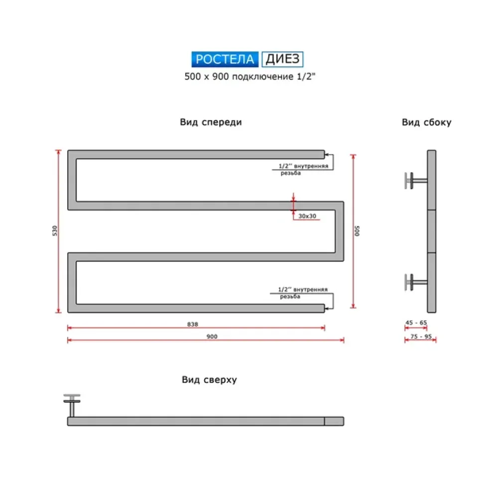 Тип: водяной , Форма: М-образный , Материал: нержавеющая сталь , Подключение: боковое , Посадочное (межосевое) расстояние: 500 мм, Посадочный диаметр: 1/2 ", Высота: 50 см, Ширина: 90 см, Цвет: полированная сталь