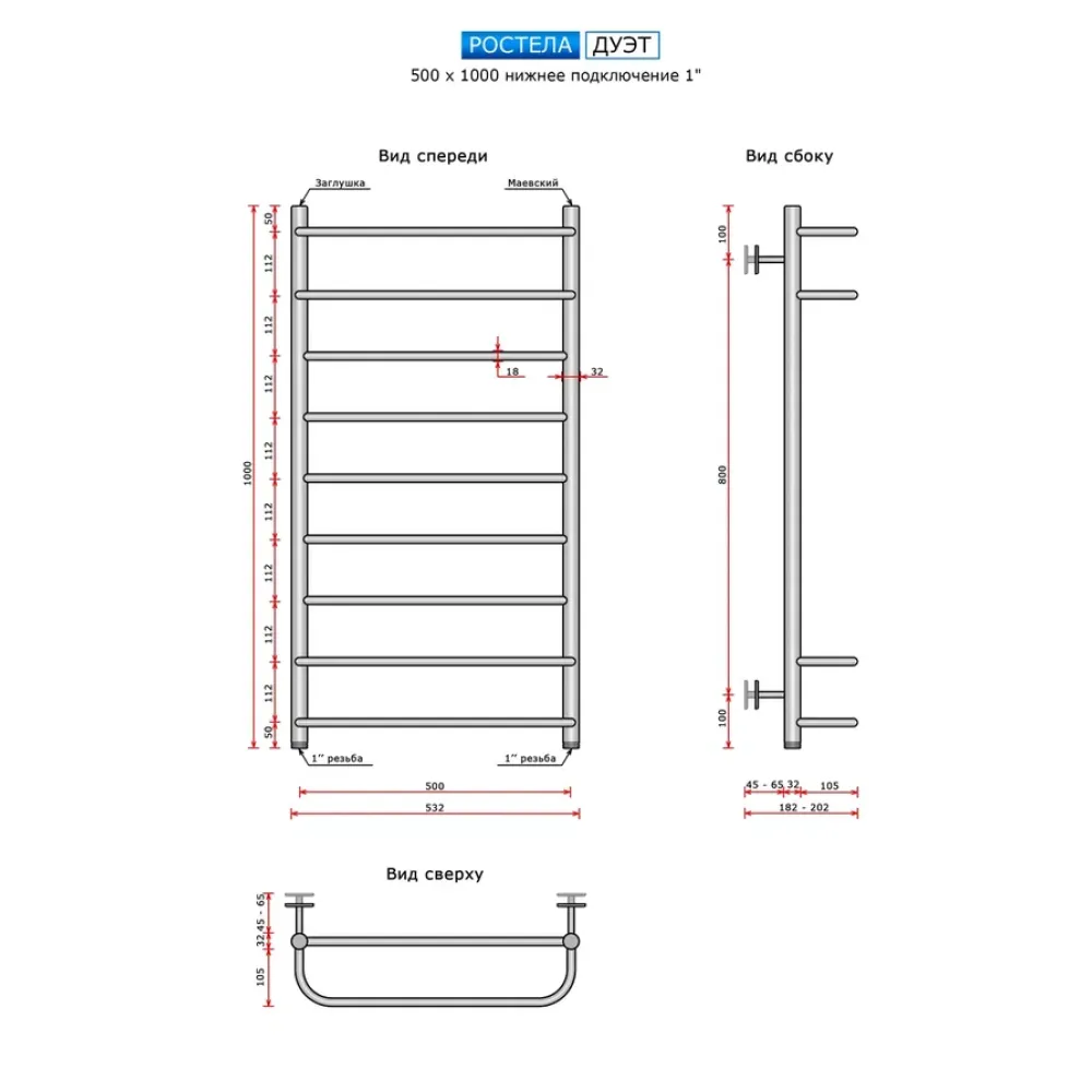 Полотенцесушитель водяной Ростела Дуэт 500x1000/8 1" нижнее подключение