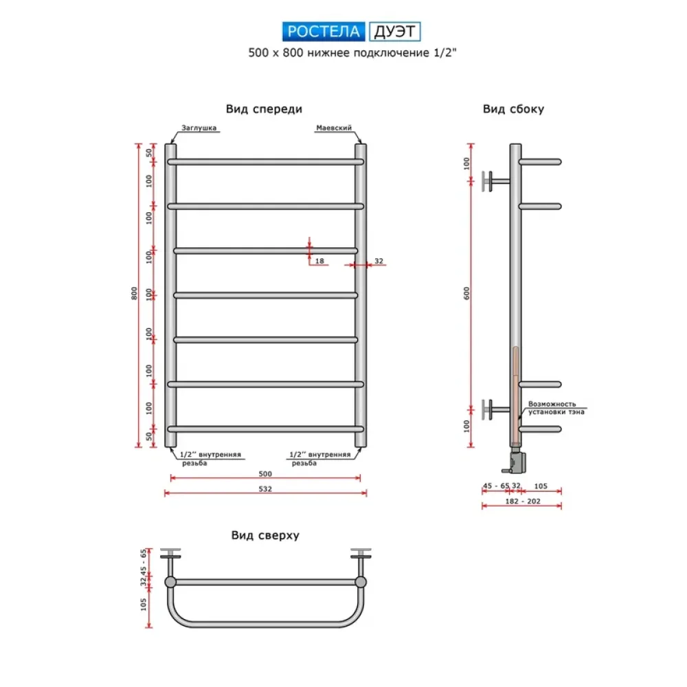 Полотенцесушитель водяной Ростела Дуэт 500x800/7 1/2" нижнее подключение