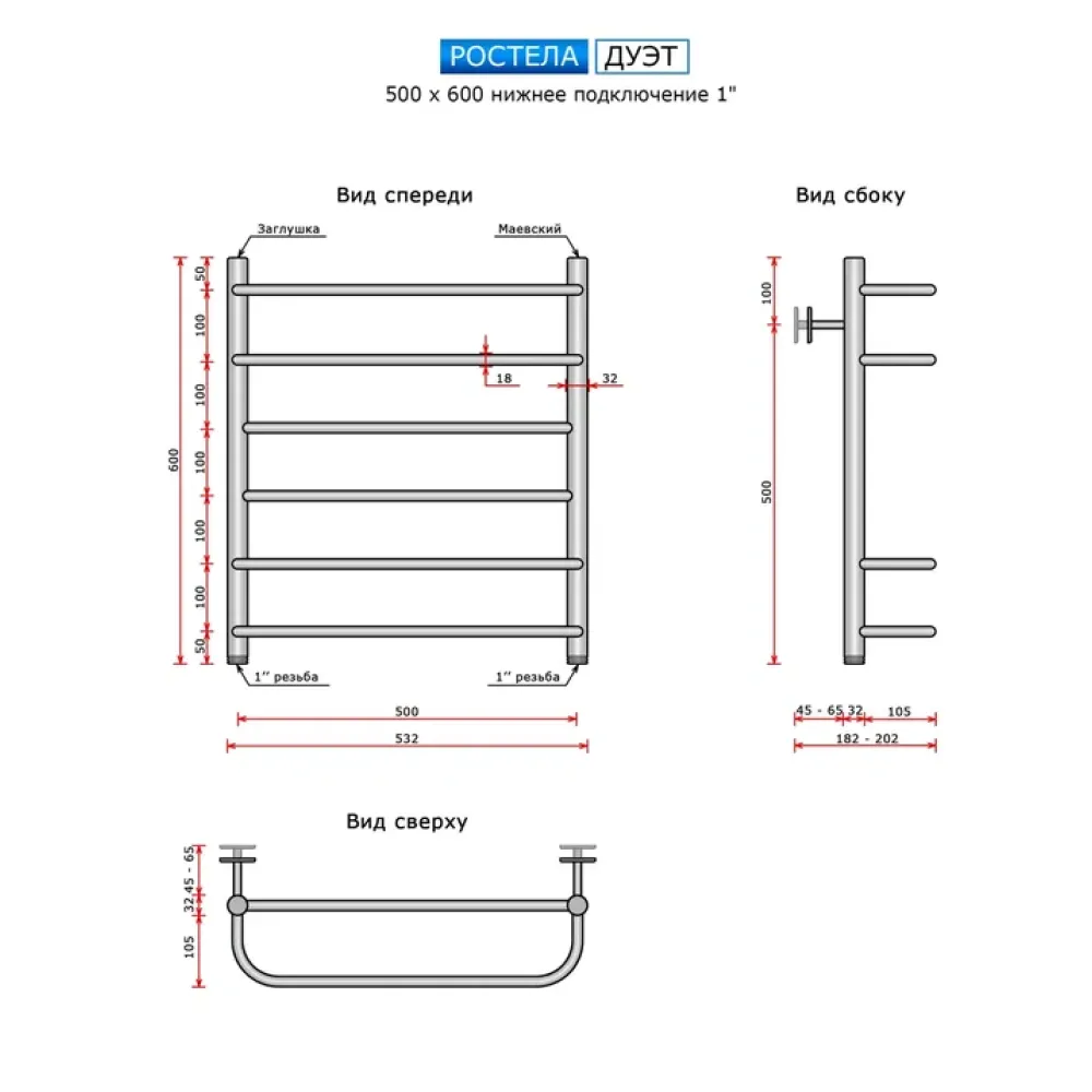 Полотенцесушитель водяной Ростела Дуэт 500x600/6 1" нижнее подключение