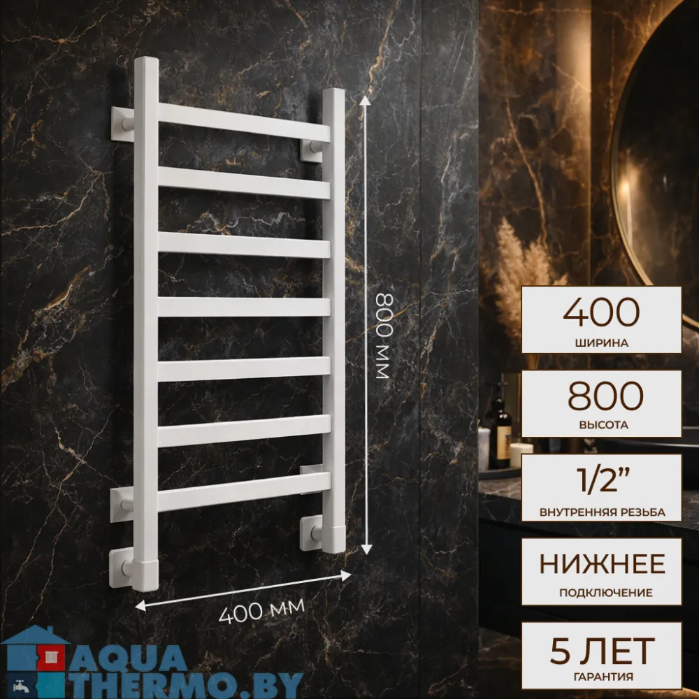 Тип: водяной , Форма: лесенка , Материал: нержавеющая сталь , Подключение: нижнее , Посадочное (межосевое) расстояние: 400 мм, Посадочный диаметр: 1/2 ", Высота: 80 см, Ширина: 40 см, Цвет: белый , Количество ребер: 7 шт.