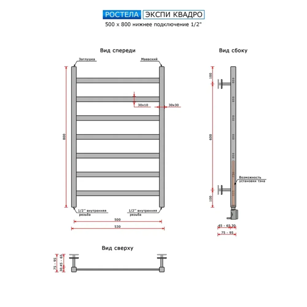 Тип: водяной , Форма: лесенка , Материал: нержавеющая сталь , Подключение: нижнее , Посадочное (межосевое) расстояние: 500 мм, Посадочный диаметр: 1/2 ", Высота: 80 см, Цвет: черный
