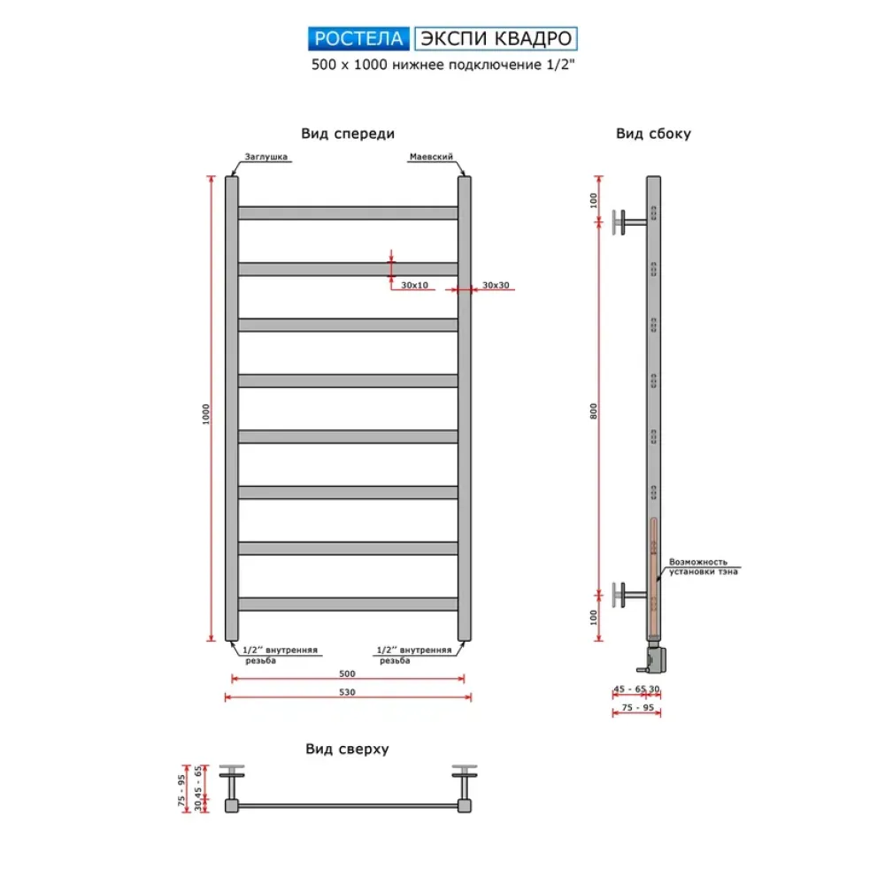 Тип: водяной , Форма: лесенка , Материал: нержавеющая сталь , Подключение: нижнее , Посадочное (межосевое) расстояние: 500 мм, Посадочный диаметр: 1/2 ", Высота: 100 см, Цвет: белый