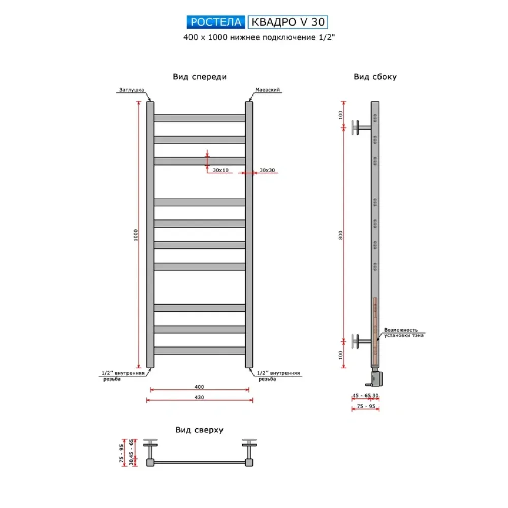 Полотенцесушитель водяной Ростела Квадро V 30 400x1000/10 1/2" нижнее подключение