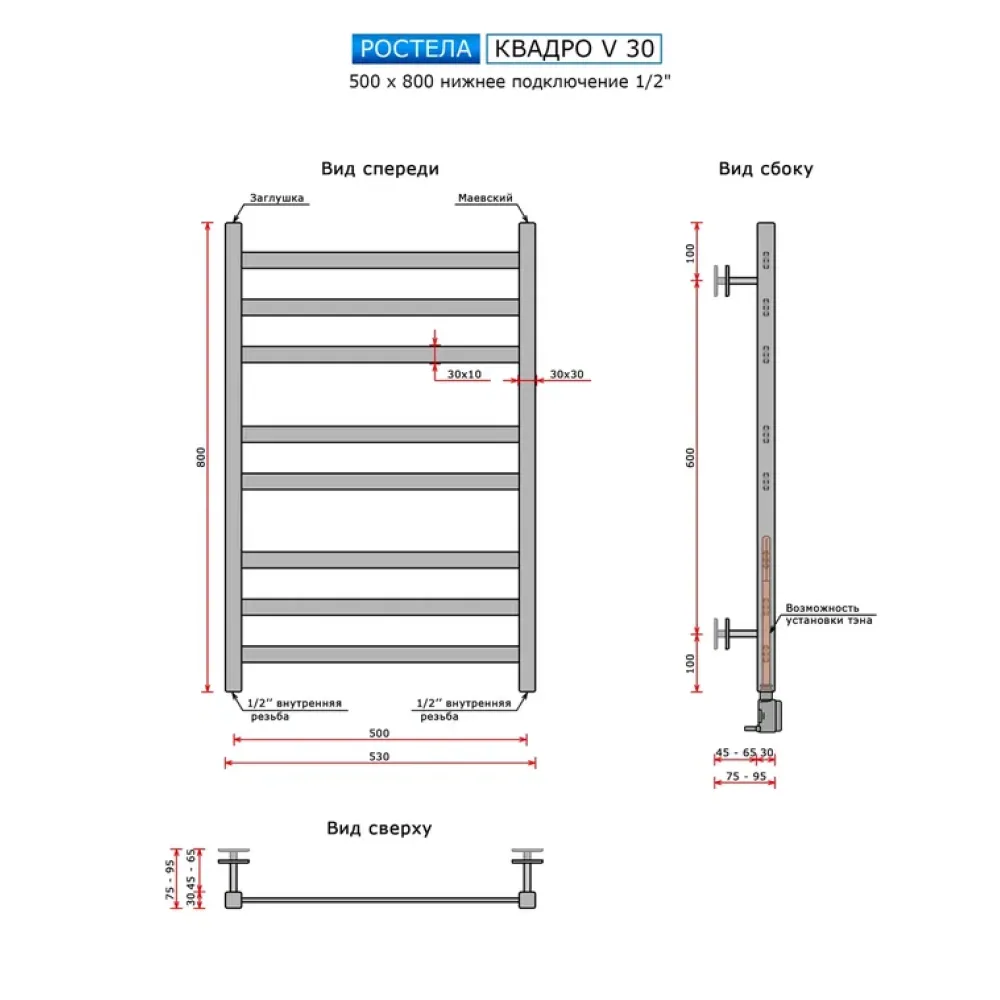 Полотенцесушитель водяной Ростела Квадро V 30 500x800/8 1/2" нижнее подключение