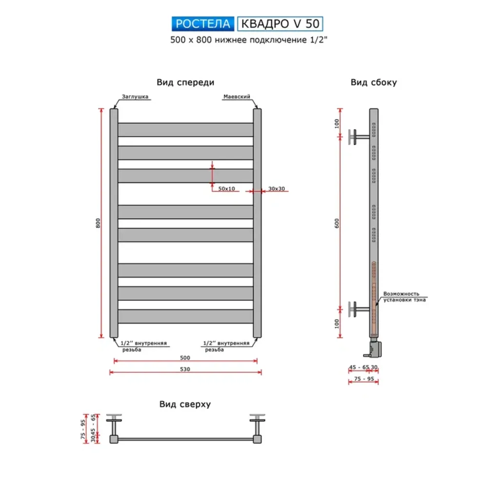 Тип: водяной , Форма: лесенка , Материал: нержавеющая сталь , Подключение: нижнее , Посадочное (межосевое) расстояние: 500 мм, Посадочный диаметр: 1/2 ", Высота: 80 см, Ширина: 50 см, Цвет: полированная сталь