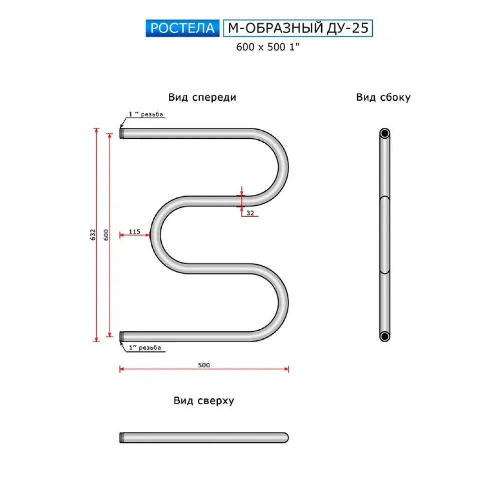 Полотенцесушитель водяной Ростела М-образный 600x500 ДУ-25