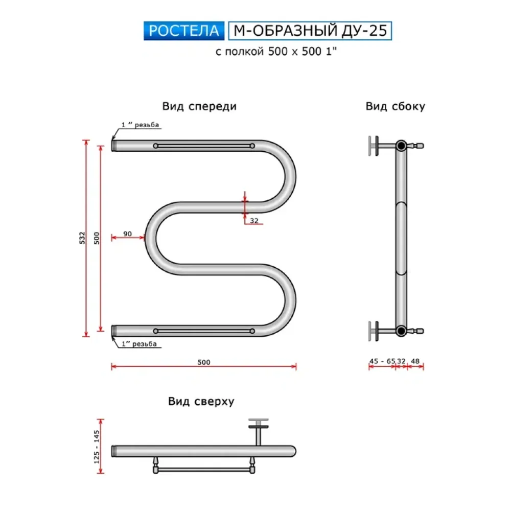 Тип: водяной , Форма: М-образный , Материал: нержавеющая сталь , Подключение: боковое , Посадочное (межосевое) расстояние: 500 мм, Посадочный диаметр: 1 ", Высота: 50 см, Ширина: 50 см, Цвет: полированная сталь