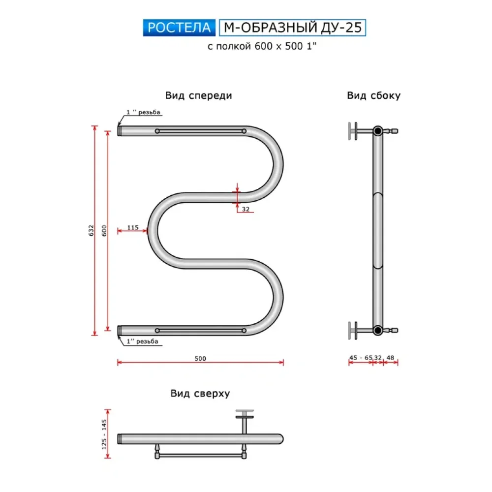 Тип: водяной , Форма: М-образный , Материал: нержавеющая сталь , Подключение: боковое , Посадочное (межосевое) расстояние: 600 мм, Посадочный диаметр: 1 ", Высота: 50 см, Ширина: 60 см, Цвет: полированная сталь