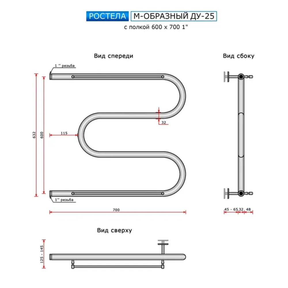 Полотенцесушитель водяной Ростела М-образный с полочкой 600x700 ДУ-25