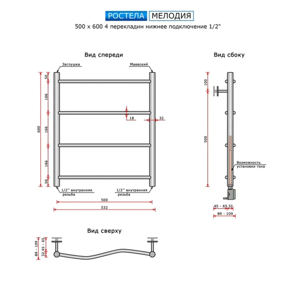 Тип: водяной , Форма: лесенка , Материал: нержавеющая сталь , Подключение: нижнее , Посадочное (межосевое) расстояние: 500 мм, Посадочный диаметр: 1/2 ", Высота: 60 см, Ширина: 50 см, Цвет: полированная сталь