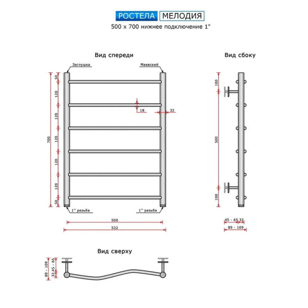Тип: водяной , Форма: лесенка , Материал: нержавеющая сталь , Подключение: нижнее , Посадочное (межосевое) расстояние: 500 мм, Посадочный диаметр: 1 ", Высота: 70 см, Ширина: 50 см, Цвет: полированная сталь