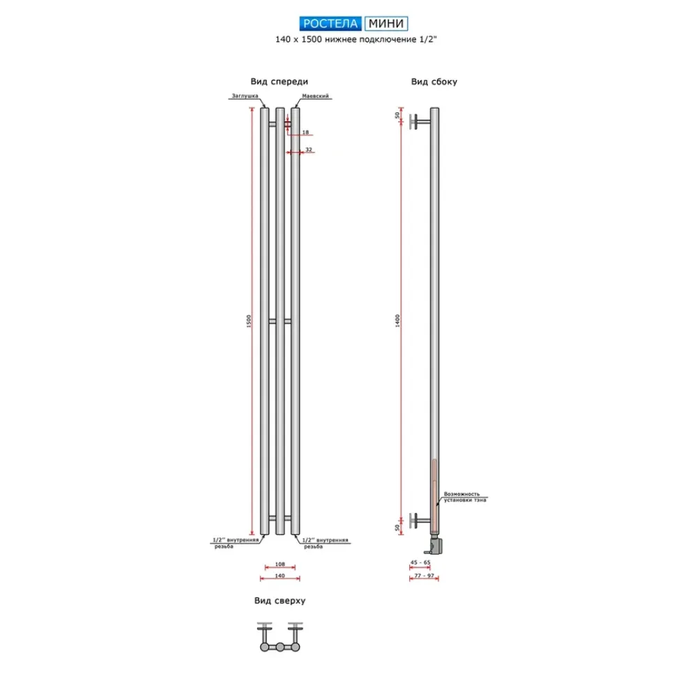 Тип: водяной , Форма: вертикальный , Материал: нержавеющая сталь , Подключение: нижнее , Посадочное (межосевое) расстояние: 108 мм, Посадочный диаметр: 1/2 ", Высота: 150 см, Ширина: 14 см, Цвет: белый , Количество ребер: 3 шт.