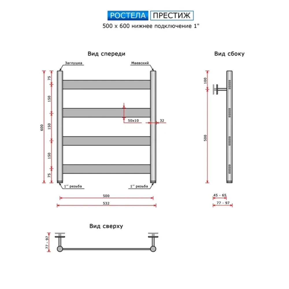 Тип: водяной , Форма: лесенка , Материал: нержавеющая сталь , Подключение: нижнее , Посадочный диаметр: 1 ", Высота: 60 см, Ширина: 50 см, Цвет: белый , Количество ребер: 4 шт.