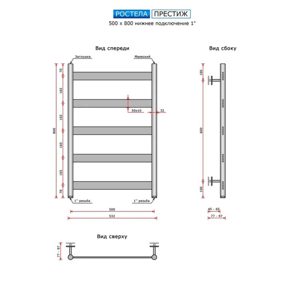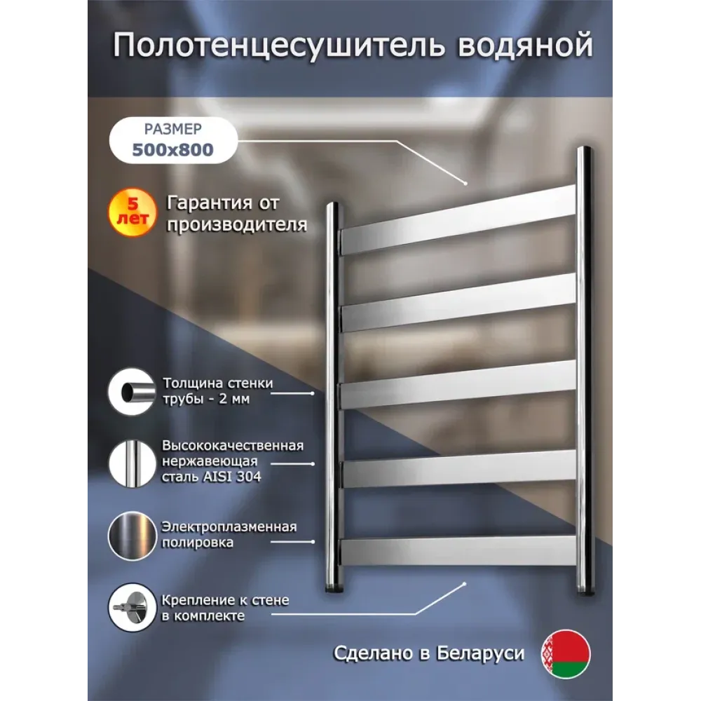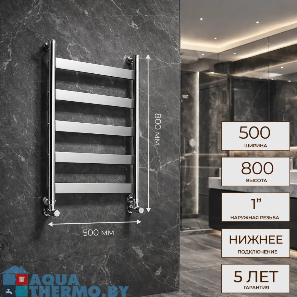 Тип: водяной , Форма: лесенка , Материал: нержавеющая сталь , Подключение: нижнее , Посадочный диаметр: 1 ", Высота: 80 см, Ширина: 50 см, Цвет: хром , Количество ребер: 5 шт.