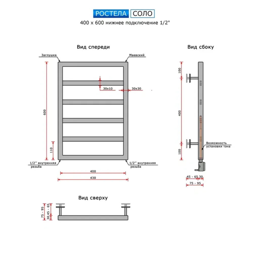 Тип: водяной , Форма: лесенка , Материал: нержавеющая сталь , Подключение: нижнее , Посадочное (межосевое) расстояние: 400 мм, Посадочный диаметр: 1/2 ", Высота: 60 см, Ширина: 40 см, Цвет: полированная сталь