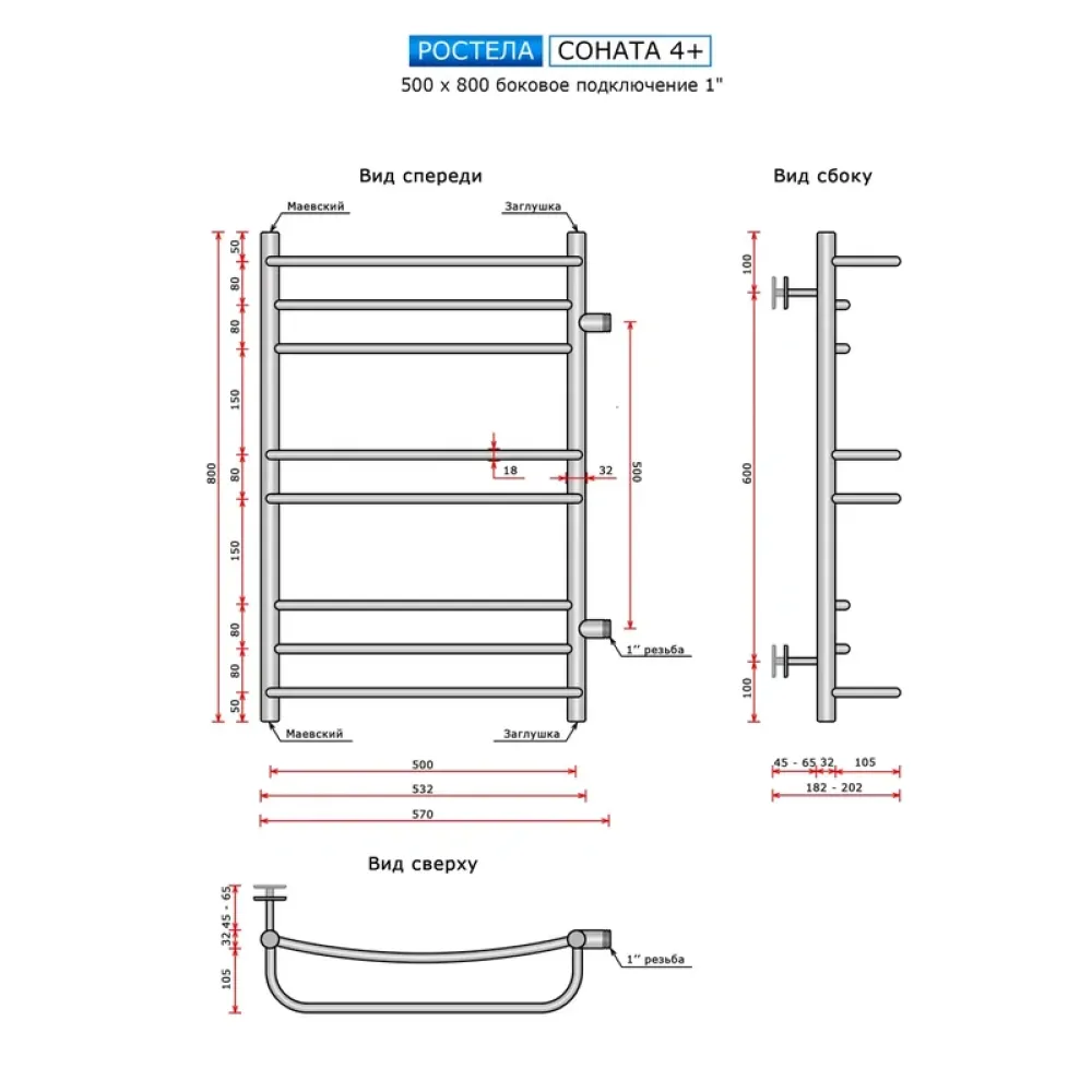 Полотенцесушитель водяной Ростела Соната 4+ 500x800 1" боковое подключение