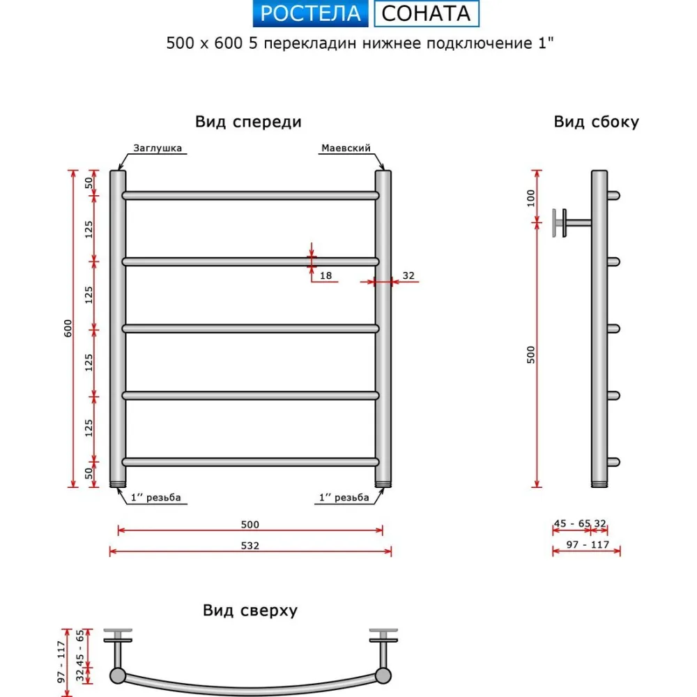 Полотенцесушитель Ростела Соната 500х600/5 1" (Ral 9005, нижнее подключение)