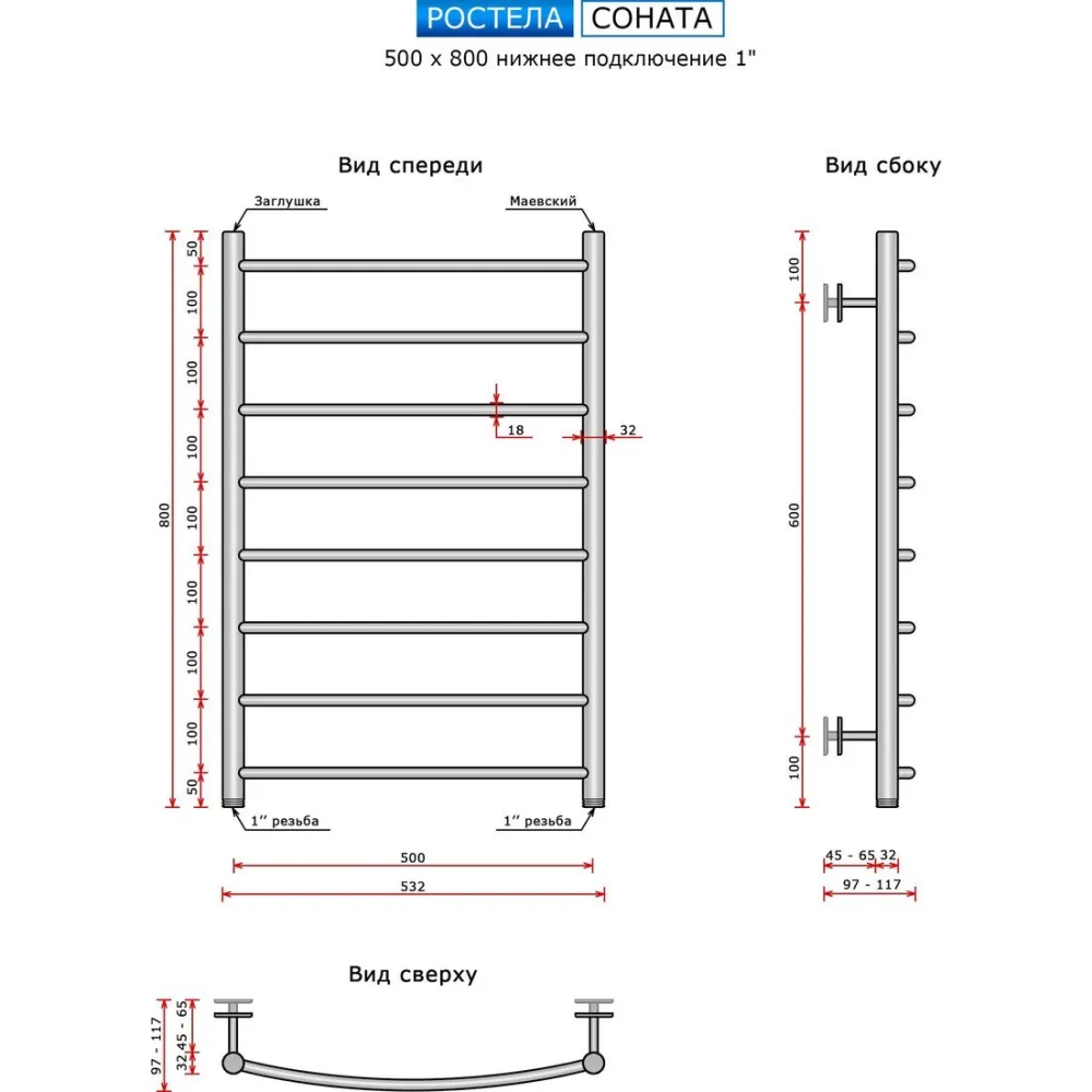 Полотенцесушитель Ростела Соната 500х800/8 1" (Ral 9005, нижнее подключение)