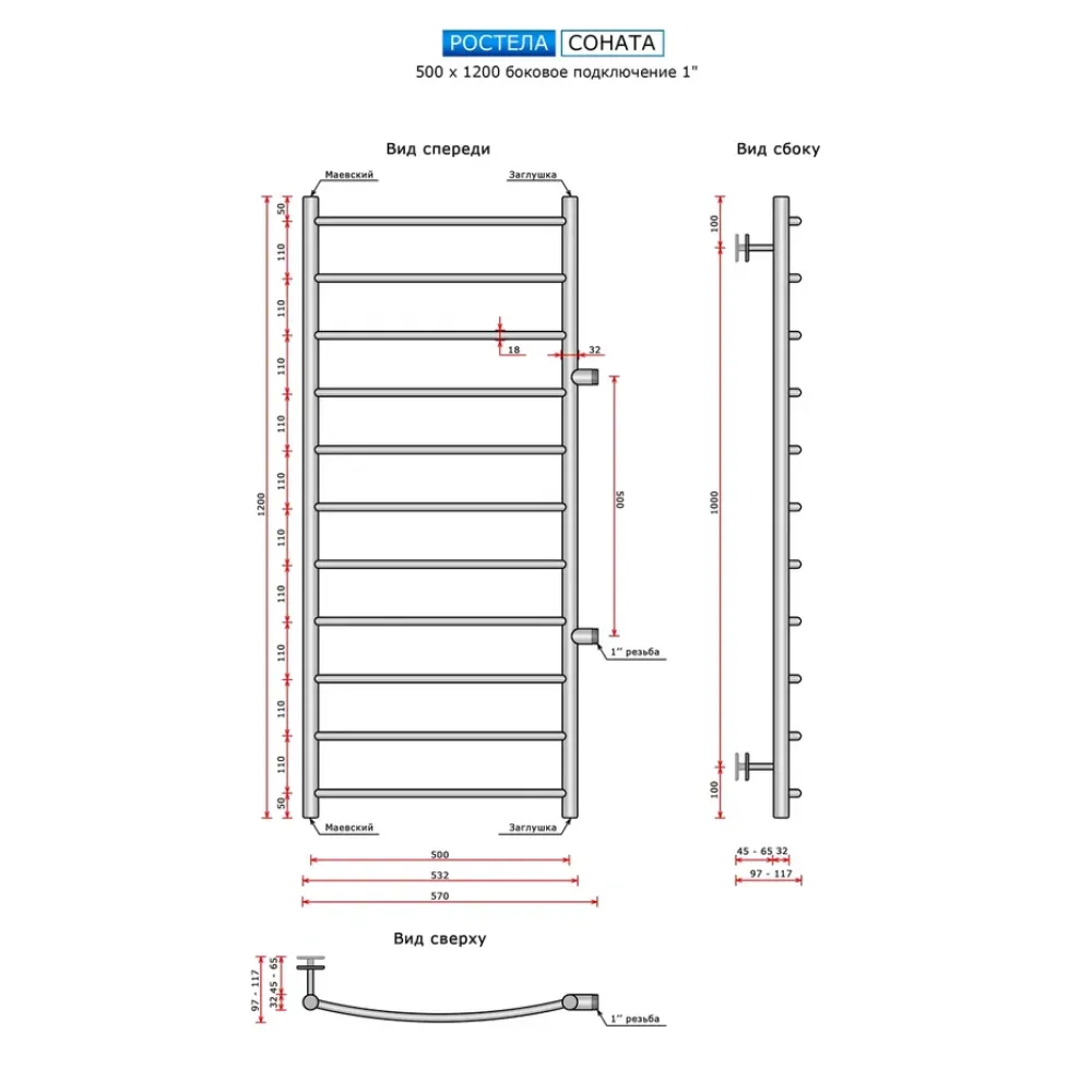 Полотенцесушитель водяной Ростела Соната 500x1200/11 1" боковое подключение