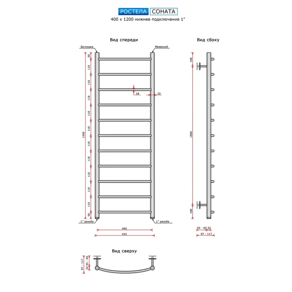 Полотенцесушитель водяной Ростела Соната 400x1200/11 1" нижнее подключение