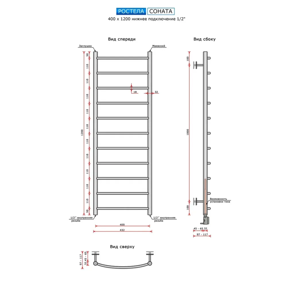 Полотенцесушитель водяной Ростела Соната 400x1200/11 1/2" нижнее подключение