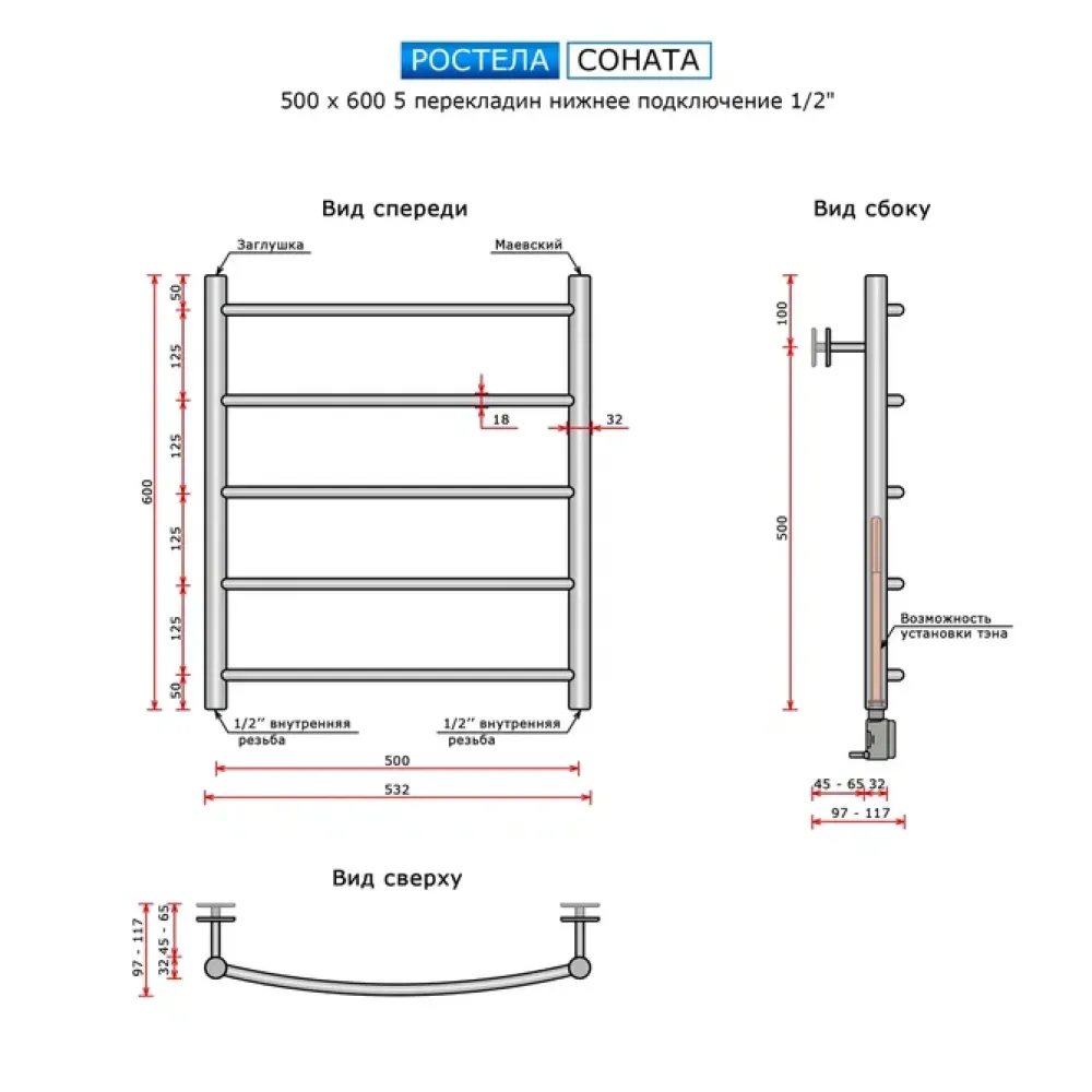 Полотенцесушитель водяной Ростела Соната 500x600/5 1/2" нижнее подключение