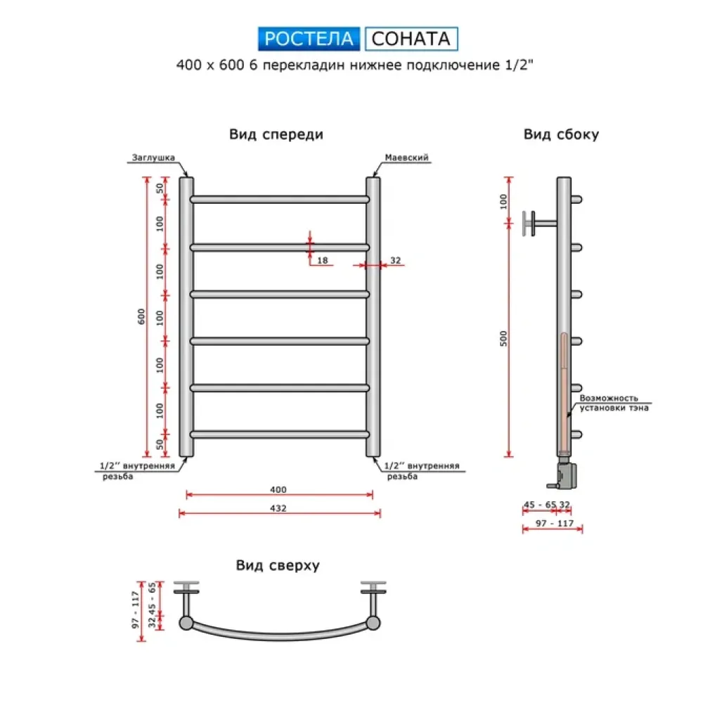 Полотенцесушитель водяной Ростела Соната 400x600/6 1/2" нижнее подключение