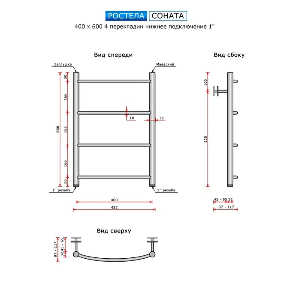 Тип: водяной , Форма: лесенка , Материал: нержавеющая сталь , Подключение: нижнее , Посадочное (межосевое) расстояние: 400 мм, Посадочный диаметр: 1 ", Высота: 60 см, Ширина: 40 см, Цвет: полированная сталь