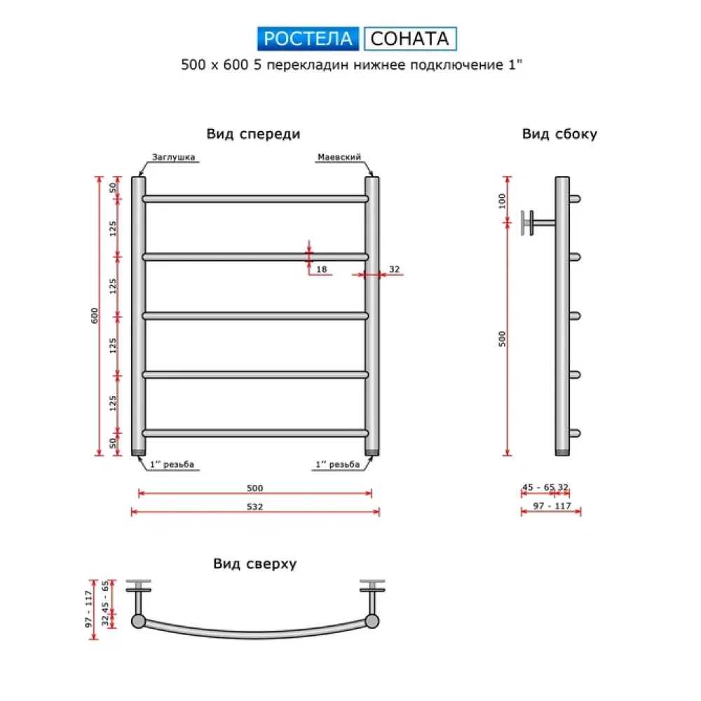 Тип: водяной , Форма: лесенка , Материал: нержавеющая сталь , Подключение: нижнее , Посадочное (межосевое) расстояние: 500 мм, Посадочный диаметр: 1 ", Высота: 60 см, Ширина: 50 см, Цвет: полированная сталь