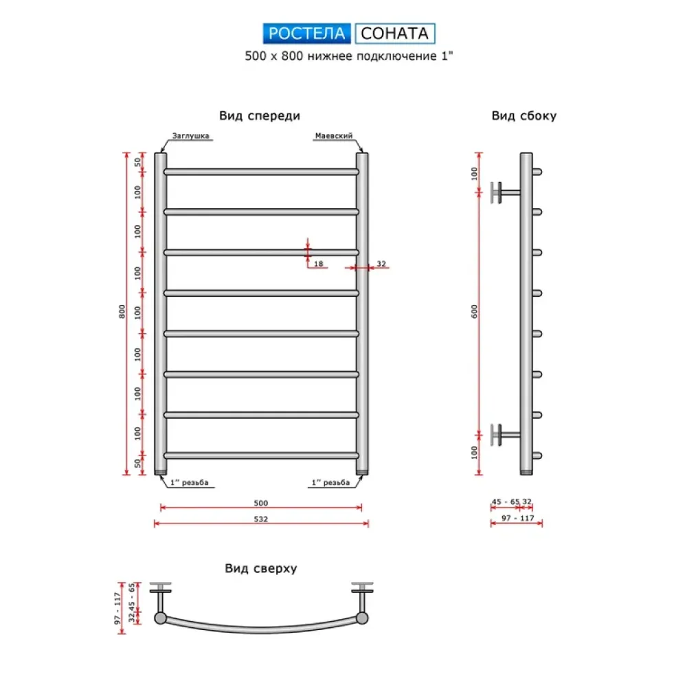 Полотенцесушитель водяной Ростела Соната 500x800/8 1" нижнее подключение