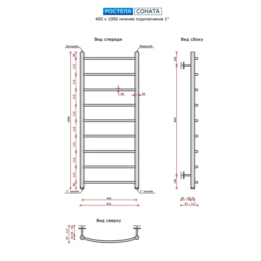 Полотенцесушитель водяной Ростела Соната 400x1000/9 1" нижнее подключение