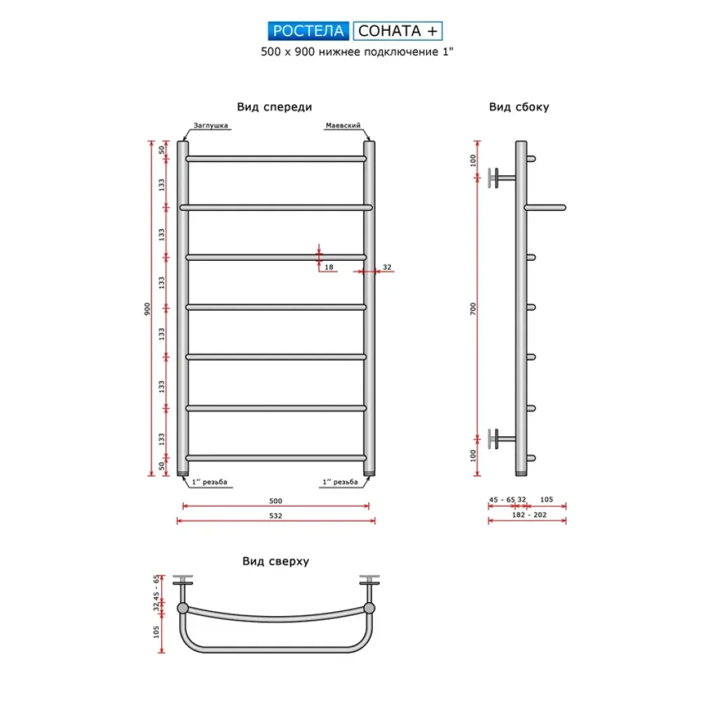 Полотенцесушитель водяной Ростела Соната+ 500x900 1" нижнее подключение
