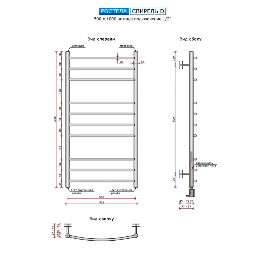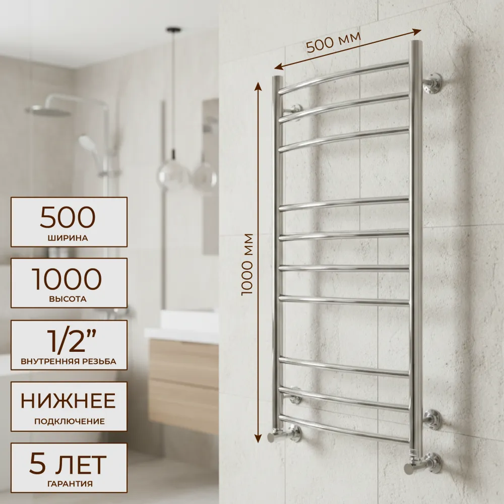 Тип: водяной , Форма: лесенка , Материал: нержавеющая сталь , Подключение: нижнее , Посадочное (межосевое) расстояние: 500 мм, Посадочный диаметр: 1/2 ", Высота: 100 см, Ширина: 50 см, Цвет: полированная сталь , Количество ребер: 10 шт., Ребра: выгнутые