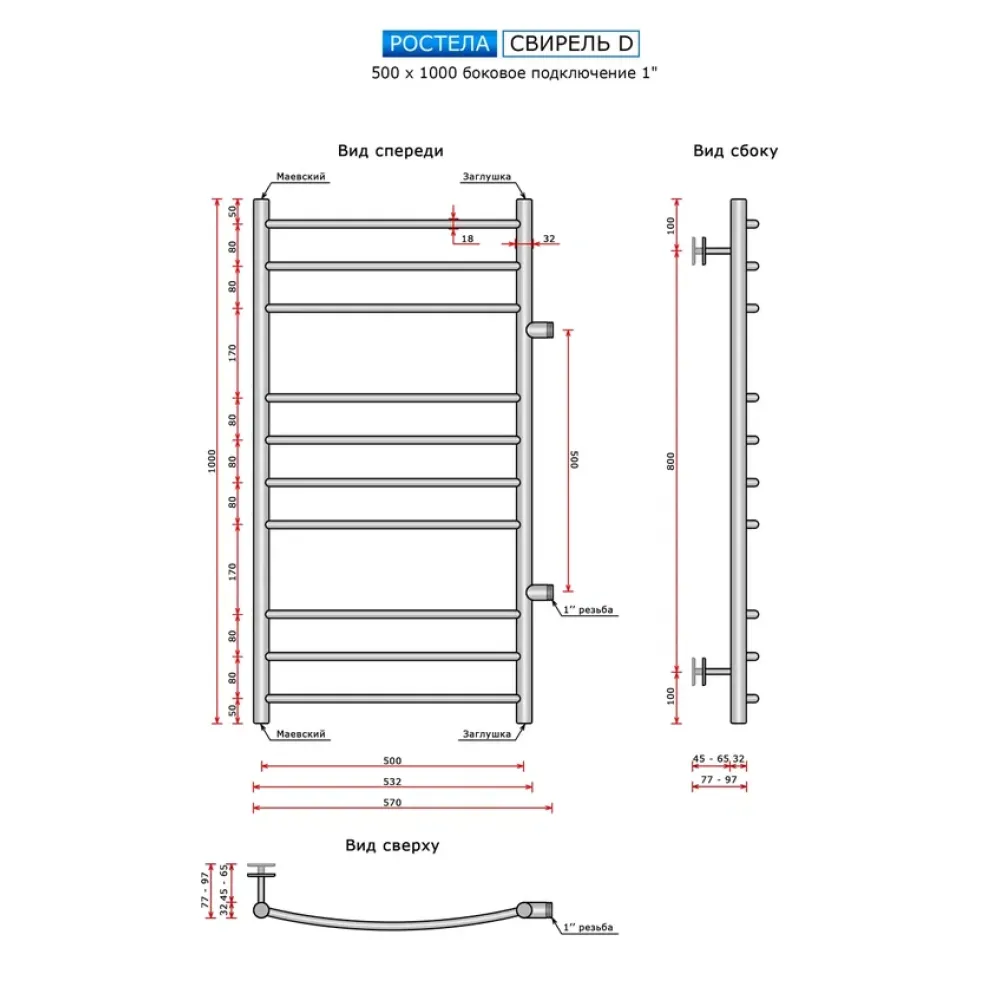 Полотенцесушитель водяной Ростела Свирель D 500x1000 1" боковое подключение