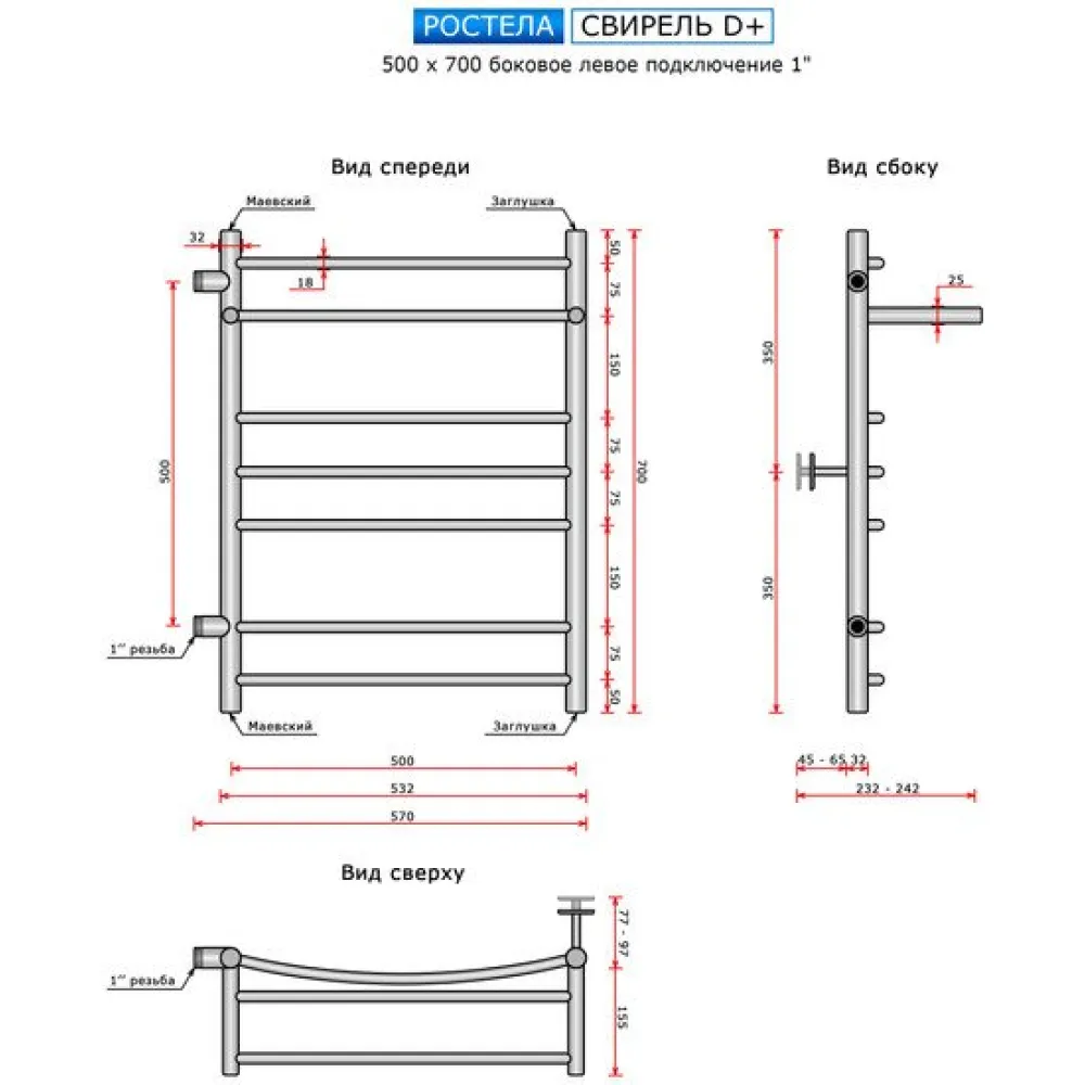 | Информация | Полотенцесушитель Ростела Свирель D+ с боковым левым подключением 1" и размером 50x70 см. Идеально подходит для квартир с действующим выходом 500мм. Полочка и поперечные дугообразные перекладины для улучшения красоты ванной комнаты. |
