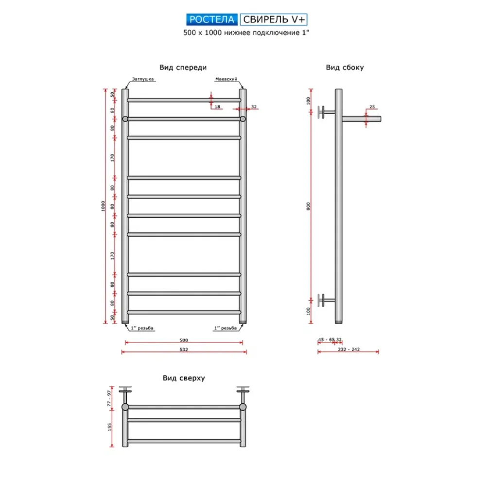 Тип: водяной , Форма: лесенка , Материал: нержавеющая сталь , Подключение: нижнее , Посадочное (межосевое) расстояние: 500 мм, Посадочный диаметр: 1 ", Высота: 100 см, Ширина: 50 см, Цвет: полированная сталь