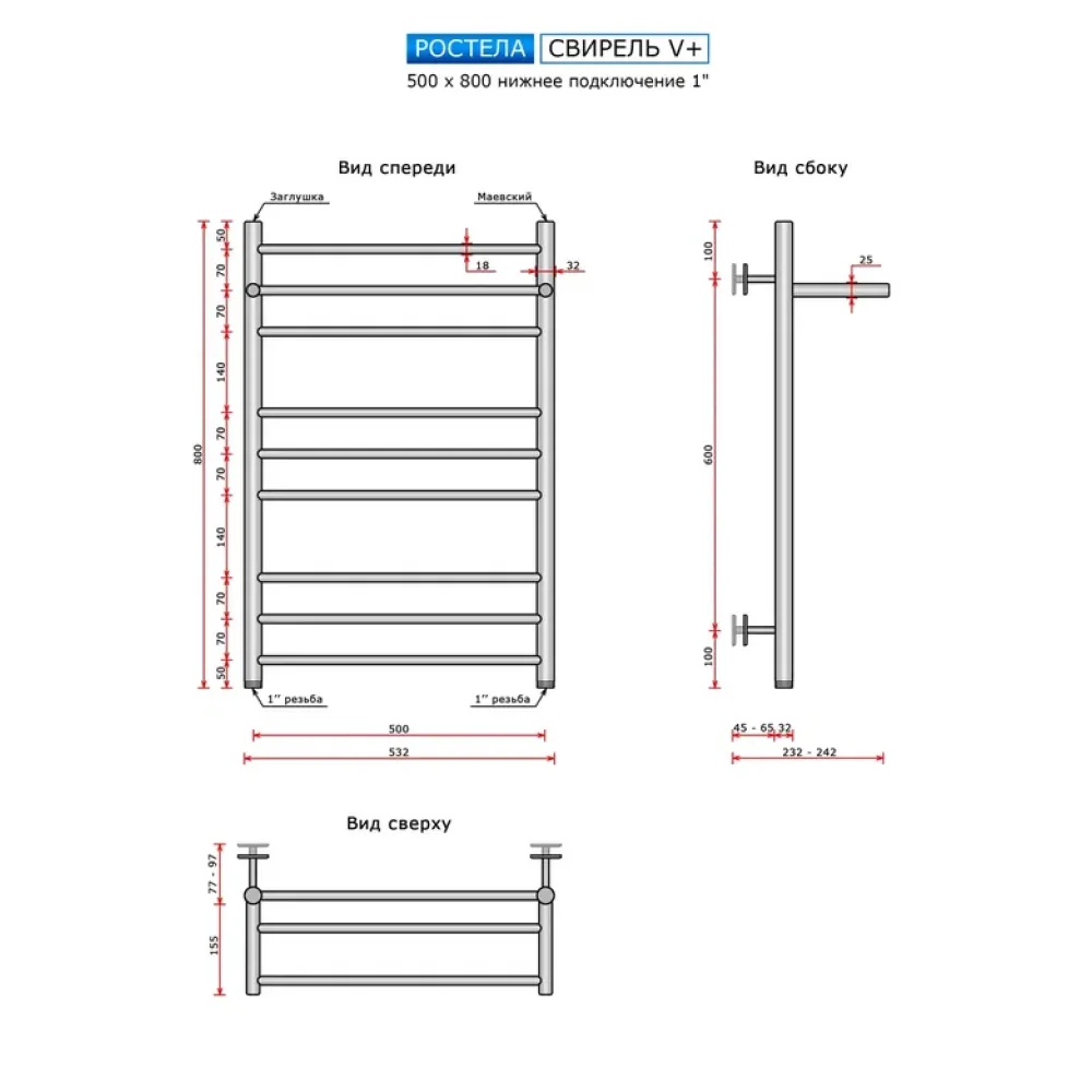 Полотенцесушитель водяной Ростела Свирель V+ 500x800 1" нижнее подключение