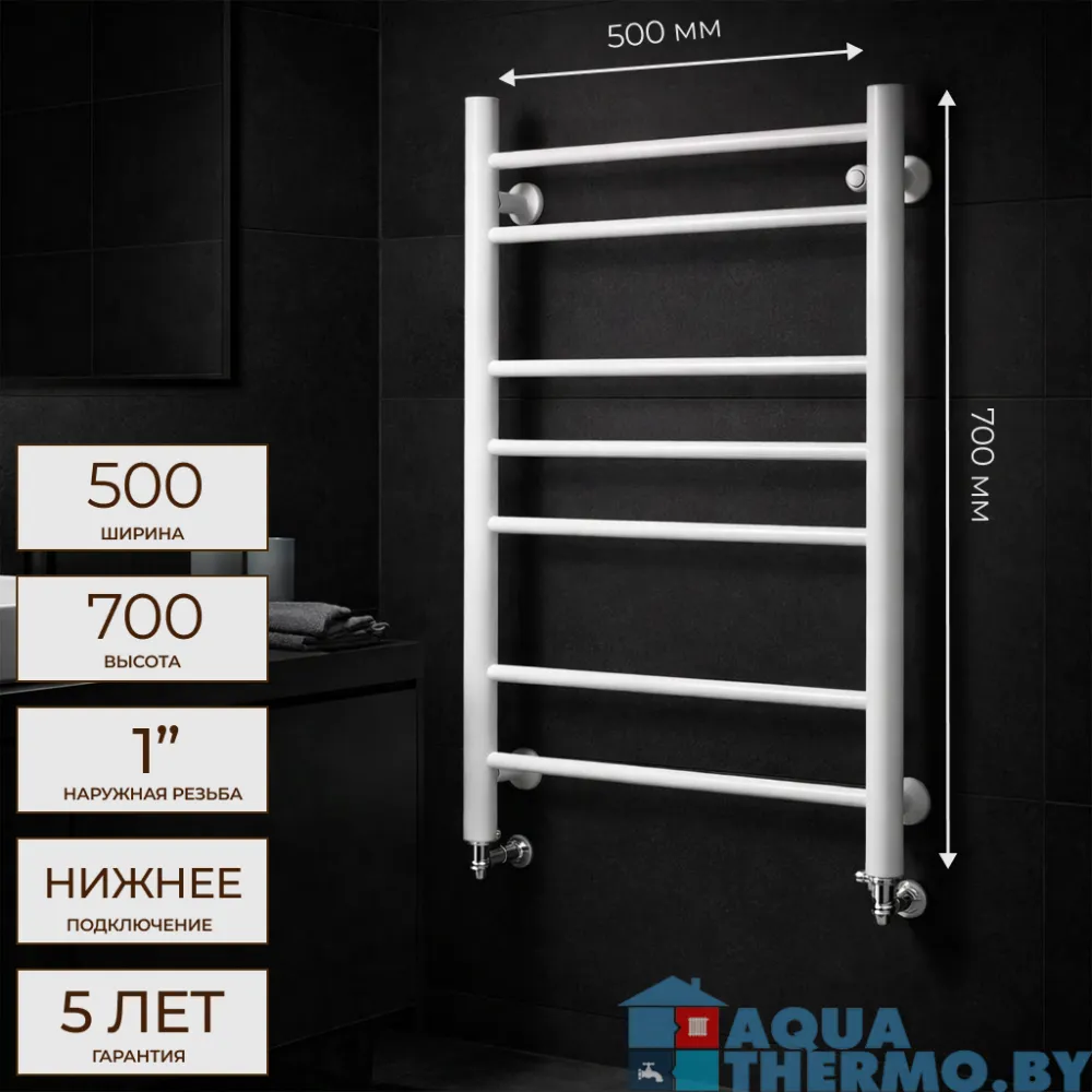 Тип: водяной , Форма: лесенка , Материал: нержавеющая сталь , Подключение: нижнее , Посадочное (межосевое) расстояние: 500 мм, Посадочный диаметр: 1 ", Высота: 70 см, Ширина: 50 см, Цвет: белый , Количество ребер: 7 шт., Ребра: прямые