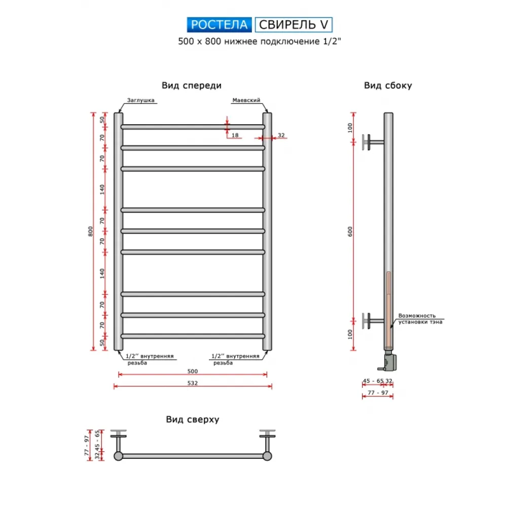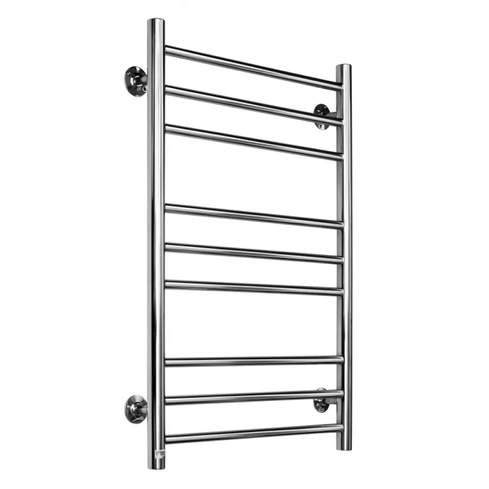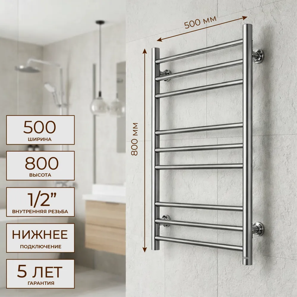 Тип: водяной , Форма: лесенка , Материал: нержавеющая сталь , Подключение: нижнее , Посадочное (межосевое) расстояние: 500 мм, Посадочный диаметр: 1/2 ", Высота: 80 см, Ширина: 50 см, Цвет: полированная сталь , Количество ребер: 9 шт., Ребра: прямые