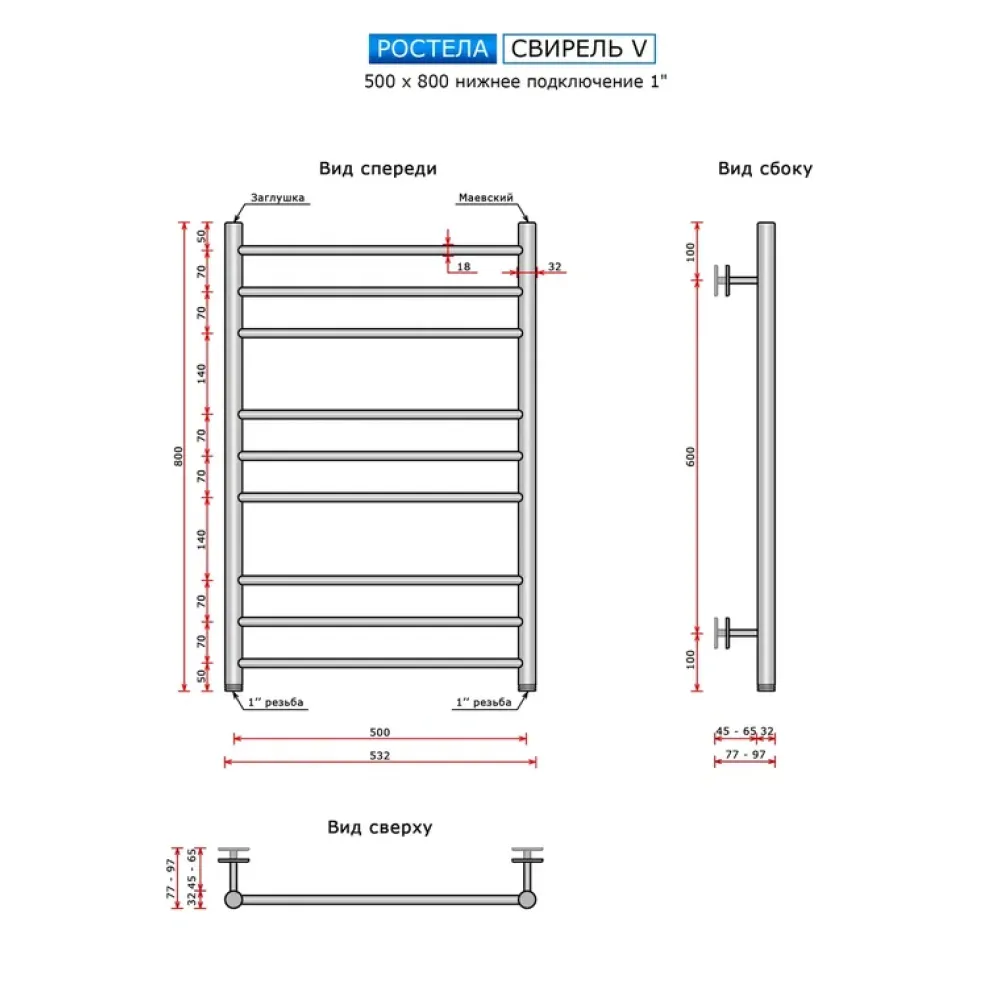 Тип: водяной , Форма: лесенка , Материал: нержавеющая сталь , Подключение: боковое , Посадочное (межосевое) расстояние: 500 мм, Посадочный диаметр: 1 ", Высота: 80 см, Ширина: 50 см, Цвет: полированная сталь