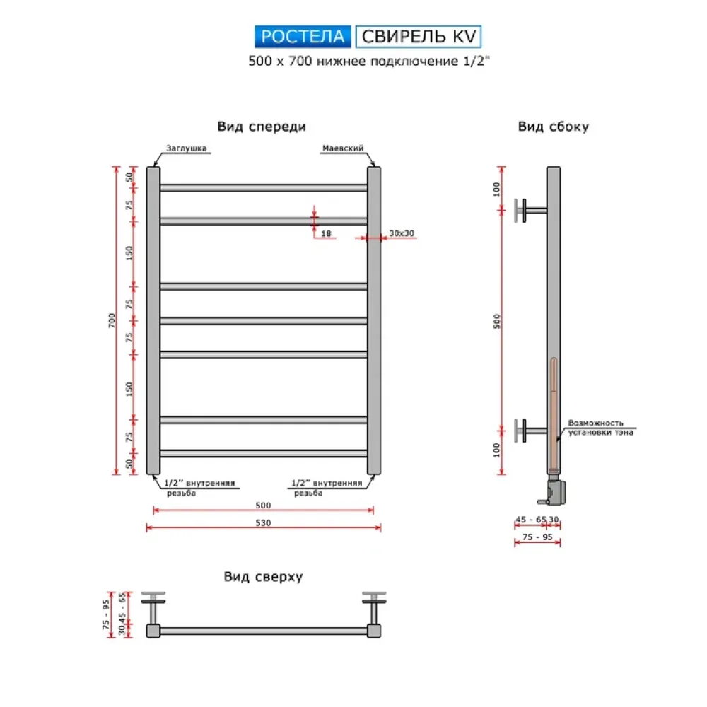 Тип: водяной , Форма: лесенка , Материал: нержавеющая сталь , Подключение: нижнее , Посадочное (межосевое) расстояние: 500 мм, Посадочный диаметр: 1/2 ", Высота: 70 см, Ширина: 50 см, Цвет: полированная сталь