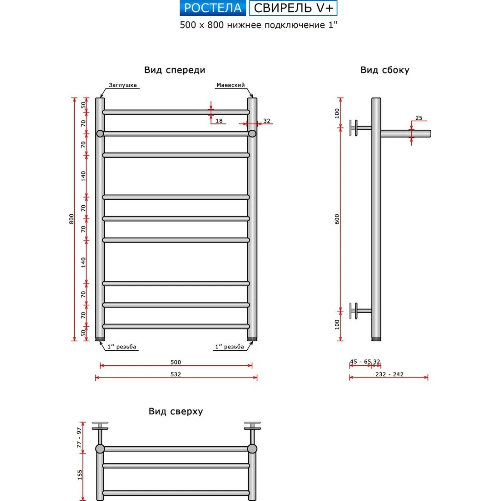 Полотенцесушитель Ростела Свирель V+ 500x800/10 1" (Ral 9005, нижнее подключение)
