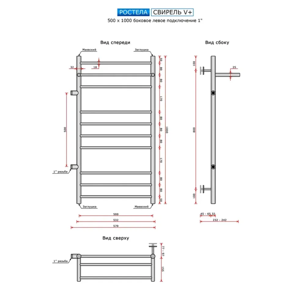 | Информация | Полотенцесушитель Ростела Свирель V+ с боковым левым подключением 1" и размером 50x100 см идеально подходит для квартир с действующим выходом 500мм. Имеет полочку и поперечные прямые перекладины для удобства использования. Рекомендуется для замены простых М или П-образных полотенцесушителей. |