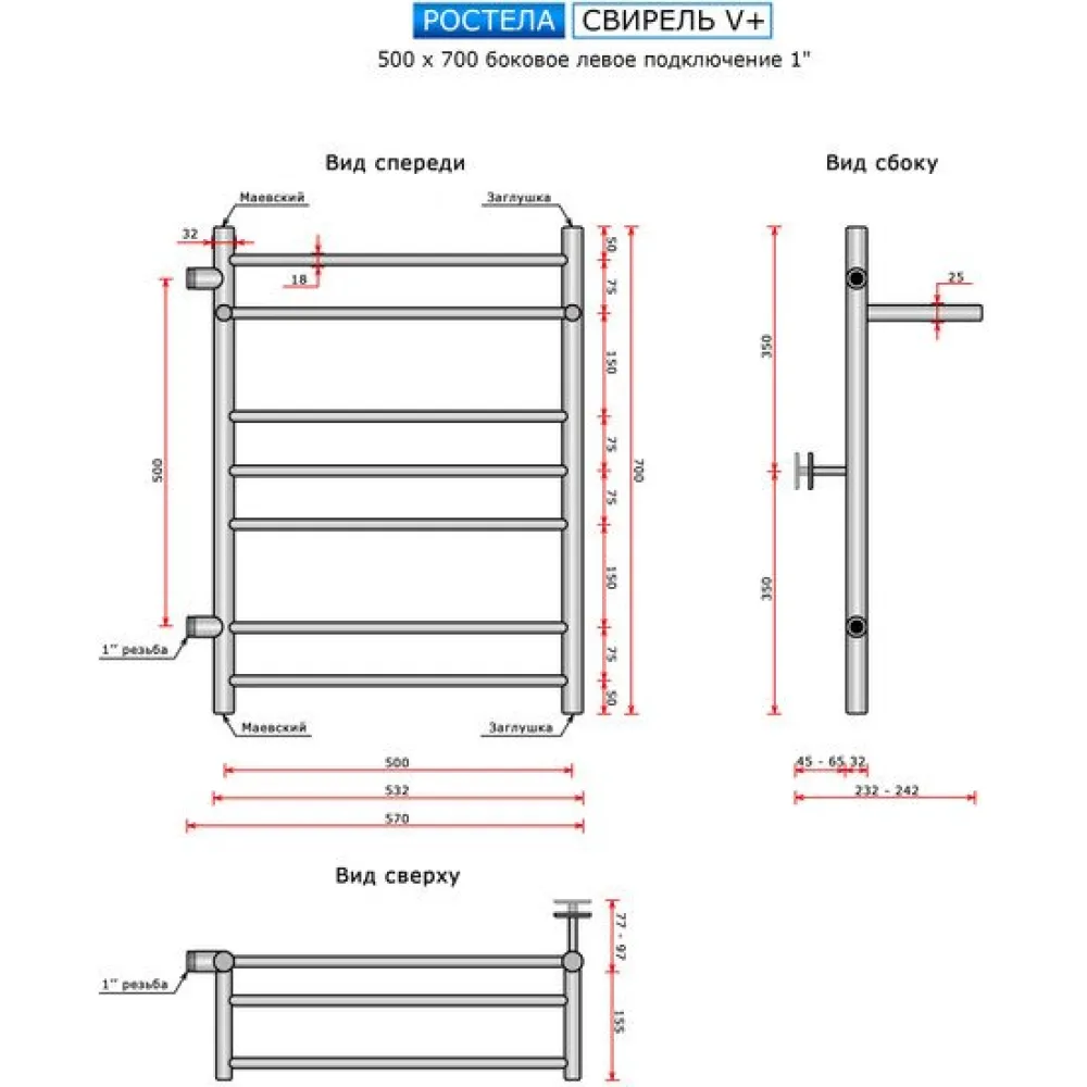Полотенцесушитель Ростела Свирель V+ боковое левое подключение 1" 50x70 см